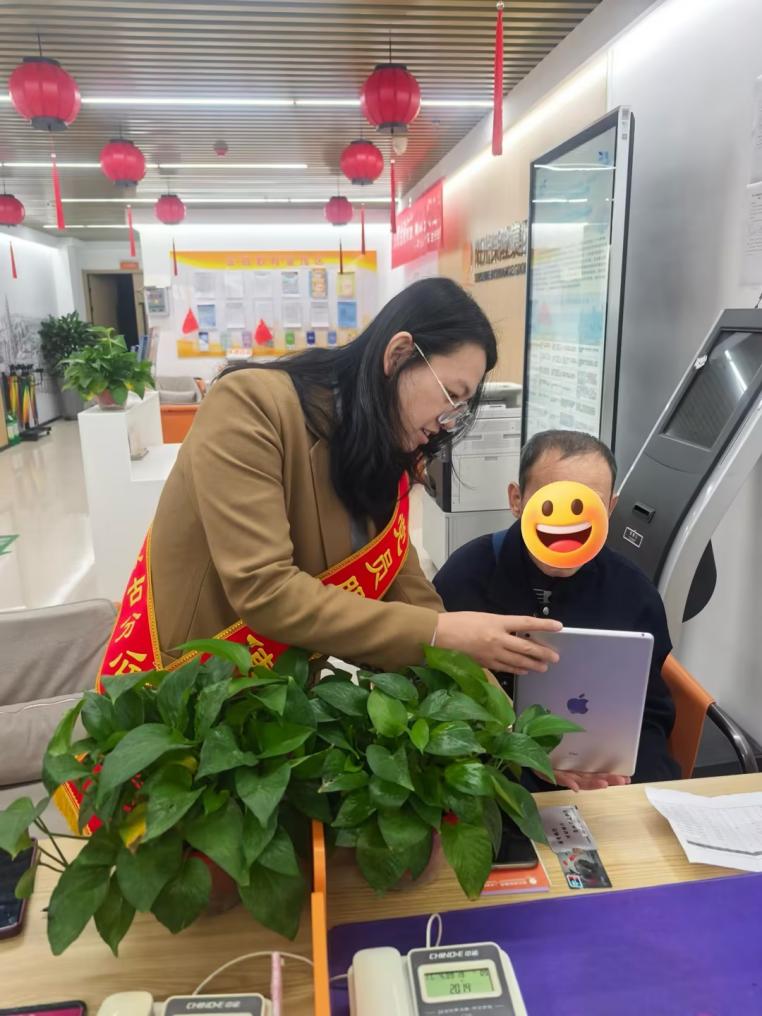 当天,注意到这位年长且行动不便的客户后,身为党员先锋岗的消保部负责人立即主动迎上,与身着橙色志愿者服装的“小橙大爱”志愿者默契配合,开启了一场无缝衔接的暖心接待。 科技适老,跨越“数字鸿沟”